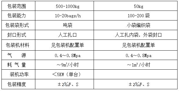 包裝速度:10-20袋/小時(shí)(噸包);100-200袋/小時(shí)(50公斤)